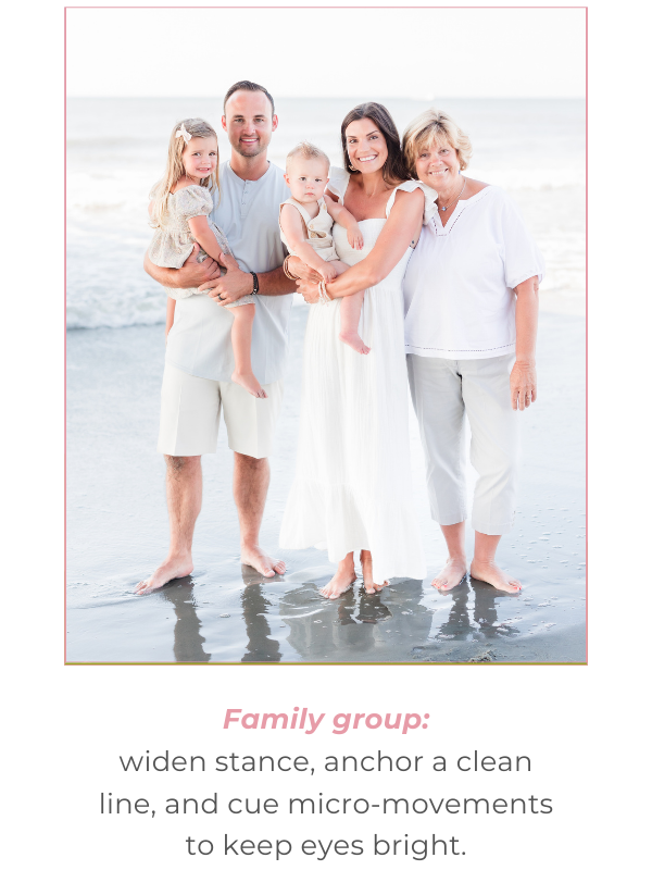 If you want a fast win, start here. I’ll show you the S.E.A. Method in action so you can read the light, lock simple settings, guide your families with ease, and try a quick “edit with me” for that clean, airy finish with the camera you already use and a clear, repeatable plan.Finish in under 30 minutes and take the printable beach cheat sheet to your next shoot.